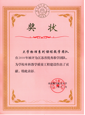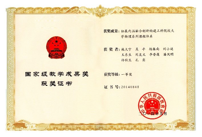 通过几代人的努力,中心取得丰富的建设成果。大学物理课程被评为江苏省精品课程;在课程建设的同时,团队也重视配套教材的建设(图2)。《工科物理教程》在如何加强物理基础、凸显教材的时代气息和工科物理特色、习题作业改革、增强教材的趣味性等方面皆作了一些大胆的探索和尝试;《物理与艺术》等教材更是开创了国内物理类素质教育先河,在全国有很强的示范引领作用。另外,我们格外重视基层教学组织建设,2010年大学物理教学团队被评为江苏省优秀教学团队。系列工作得到广泛认可,2011年获江苏省教学成果特等奖,《拓展内涵 融合创新 构建工科院校大学物理系列课程体系》荣获2014年国家级教学成果一等奖(图3)。在这个过程中涌现出国家级教学名师施大宁教授,江苏省教学名师杨雁南教授等先进人物。