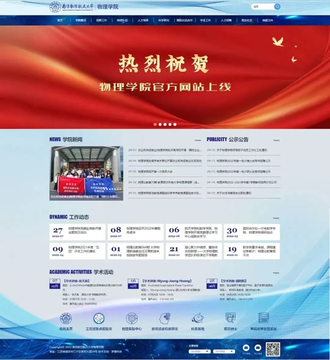 新学院,新气象。在前期充分调研和广泛征求意见的基础上,学院于6月下旬启动了官方网站建设工作,经过几轮设计修改、编程测试及内容更新,必威betway西汉姆官方网站即日起正式运行。必威betway西汉姆官方网站主色调采用南航蓝,融入物理与空天特色。网站包含必威概况、党群工作、师资队伍、人才培养、betway、国际交流合作、学生工作、人才招聘、院友社区和制度文件等十个栏目,全面细致地展示了必威betway西汉姆全新的风貌。