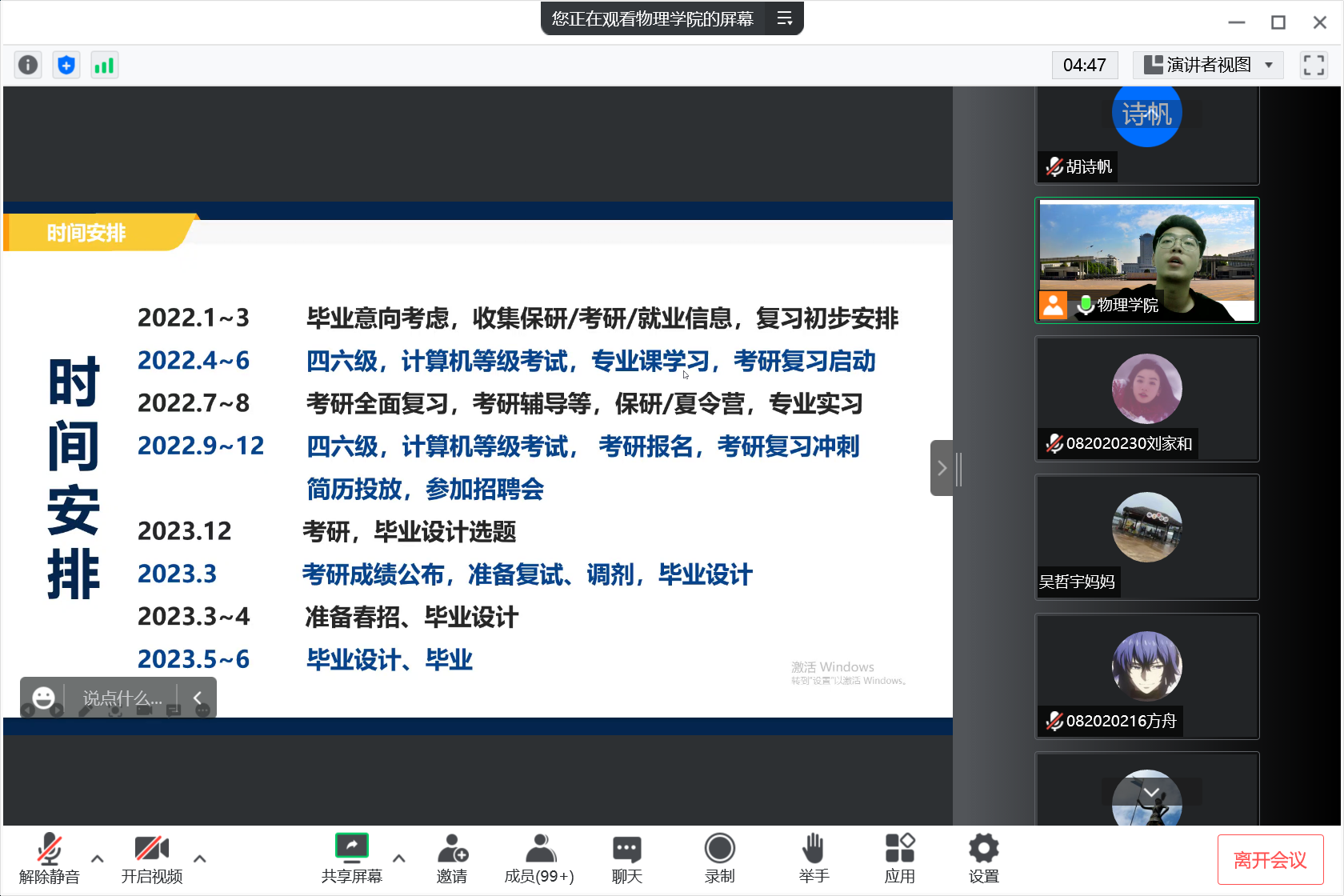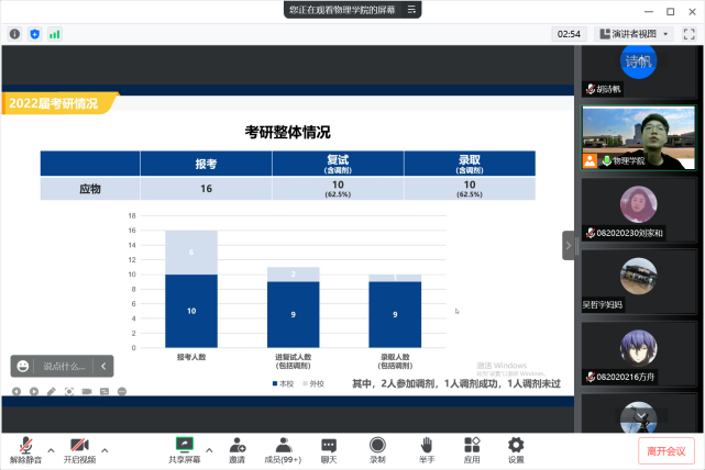 胡诗帆分析了近年来物理专业的升学、就业数据,让学生及家长对本专业的升学就业有更加全面深入的认识,提醒家长督促学生对标自身情况合理选择,并以实际行动做好充足准备并分享了3个成功案例;面向2019级学生展示大四升学就业节奏时间轴,以周为单位详细解读了每个阶段该做的事情,进行了秋招动员,鼓励学生深入到招聘市场去更多地了解单位的人才需求,为自己的职业生涯规划积累经验。