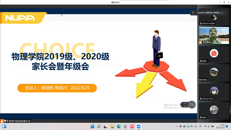 胡诗帆分析了近五年来物理专业的升学、就业数据,让学生及家长对本专业的升学就业有更加全面深入的认识,提醒家长督促学生对标自身情况合理选择,并以实际行动做好充足准备,并分享了3个成功案例;面向2019级学生展示大四升学就业节奏时间轴,以周为单位详细解读了每个阶段该做的事情,并进行了秋招动员,鼓励学生深入到招聘市场去更多地了解单位的人才需求,为自己的职业生涯规划积累经验。