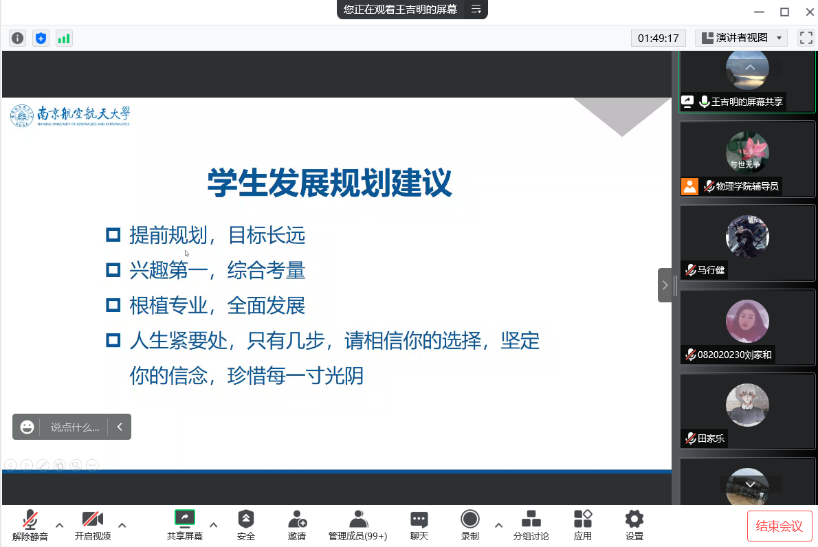 尤文龙、王吉明针对学生考研意向学生占比大的情况,介绍了学院物理系、应用物理系的专业方向、前景、人才培养情况,欢迎学生报考本校本专业或者工科其他专业,并针对学生在考研准备、院校选择、未来发展规划等方面的困惑给出建议;介绍了学院开设的科创双选、本科生进课题组等活动和做法,鼓励学生积极参与,全面提升创新、实践等综合素质能力;建议本科生多与“1+4”导师、科创导师进行交流,更好地得到指导,全面发展。
