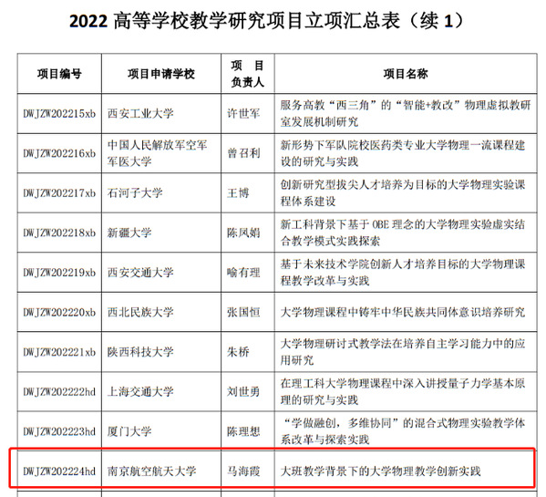 为了推动“大学物理”和“大学物理实验”课程的教学改革,提高教学质量,教育部高等学校大学物理课程教学指导委员会(以下简称教指委)在2022年7月开展了全国高等学校教学研究立项项目申报和评审工作。经单位申报、教指委地区工作委员会初评、专家网络评审、教指委教学研究工作委员会审核和教指委主任联席会议审定,最终确定40项申报项目为2022年高等学校教学研究立项项目,我院马海霞副教授的《大班教学背景下的大学物理教学创新实践》项目获批。