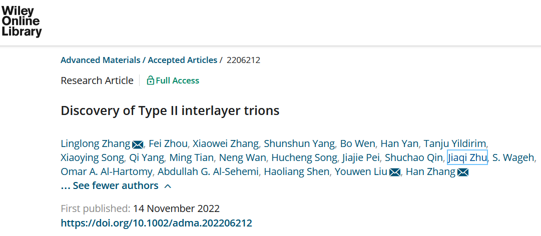 近日,国际顶级期刊《Advanced Materials》(先进材料,IF:32.09)在线发表我校必威betway西汉姆团队的研究成果“发现II类层间三激子”。