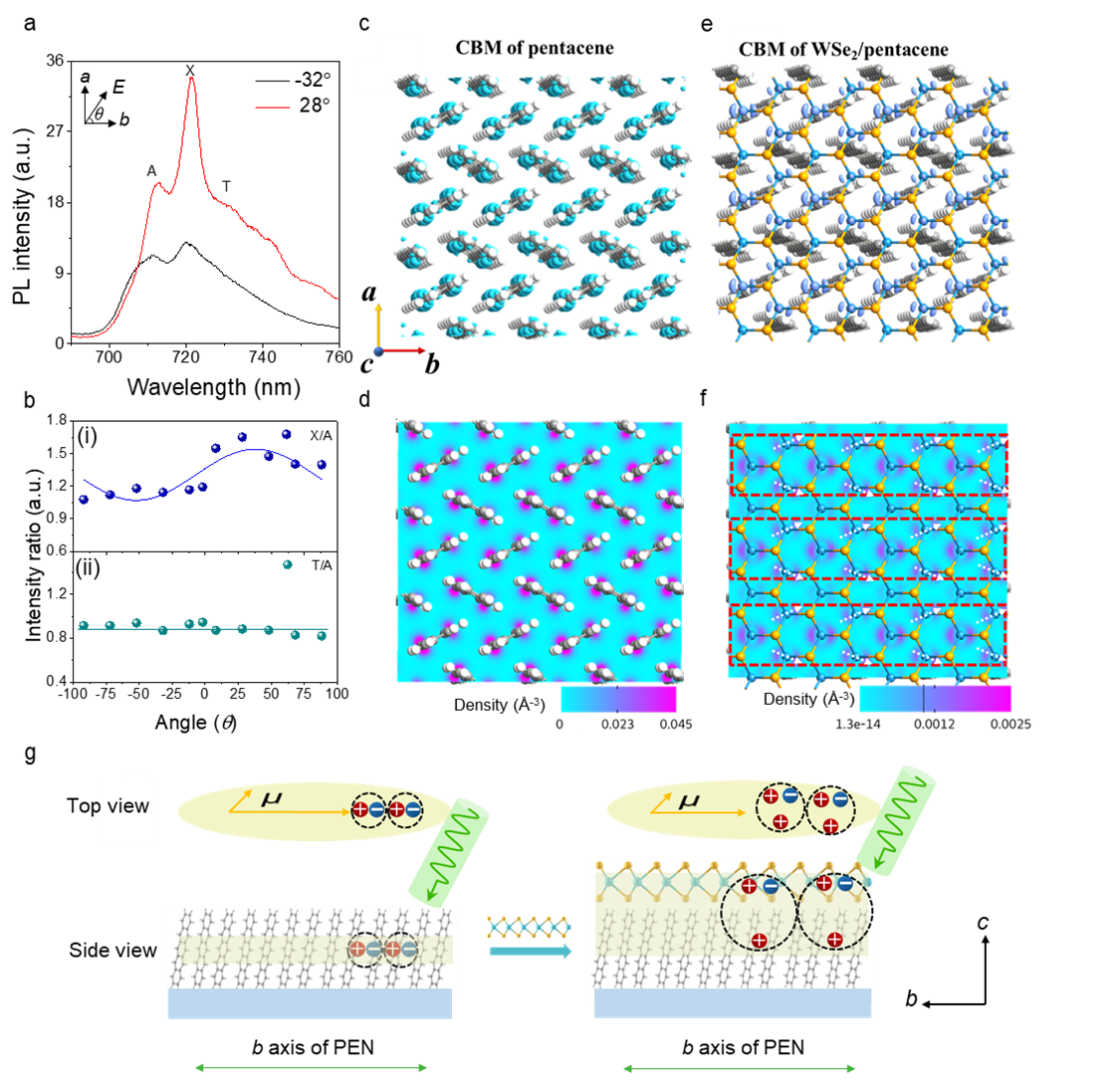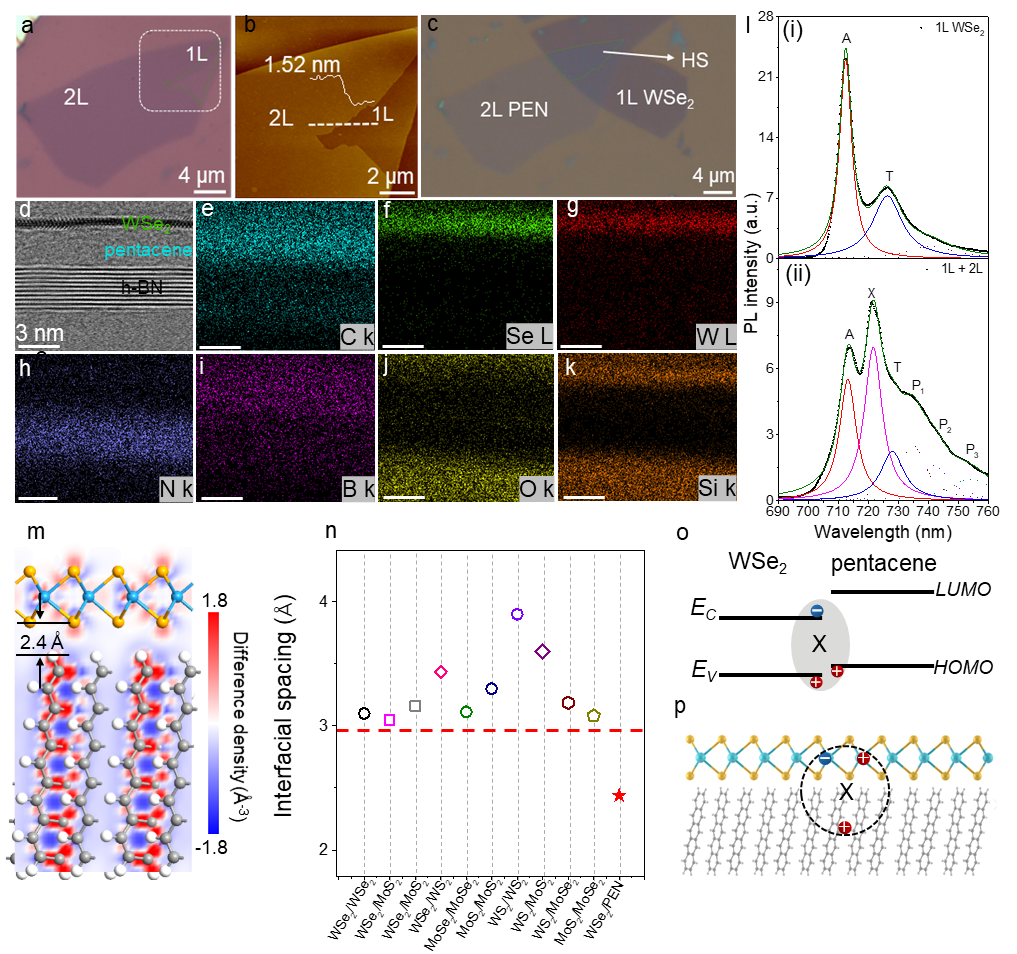 图1 | 单层硒化钨(WSe2)/双层并五苯(pentacene)异质结的表征。