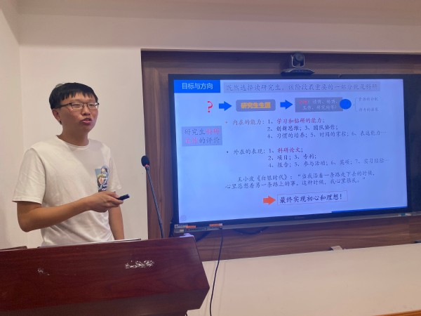 在研究生朋辈经验交流环节,物理学专业2019级博士生、2022年国家奖学金获得者万鹏面向新生作经验交流分享,结合自己的求学经历向学弟学妹们传授了科研学习经验,建议大家要做好时间管理,制定研究计划。电子信息专业2022级硕士生李宵杰向新生介绍了自己对本专业的学习体会。他鼓励学弟学妹们要立志专心科研,在未来的研究生时光里有所成长、有所成就。