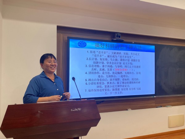 副院长阚彩侠向学院66名研究生新生表达了祝贺和欢迎,希望同学们尽快适应研究生阶段的学习生活,首先要学会独立思考、主动沟通,独立自主的学习探索是基础,学会团结包容,和导师、同学交流分享、共同攻关是关键,其次做基础学科研究,既要有国际视野,还要有交叉思维,需要开阔眼界、关注国际前沿动态,多和应用研究交叉,不断探索创新,最后要劳逸结合,强健的体魄是做好科研的基础。