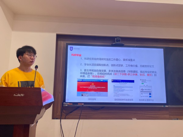 刘威从选课步骤、培养方案和课程学分要求等方面,对新生进行了详细的选课指导。梁欢为新生解读了入学注意事项和相关规章制度。