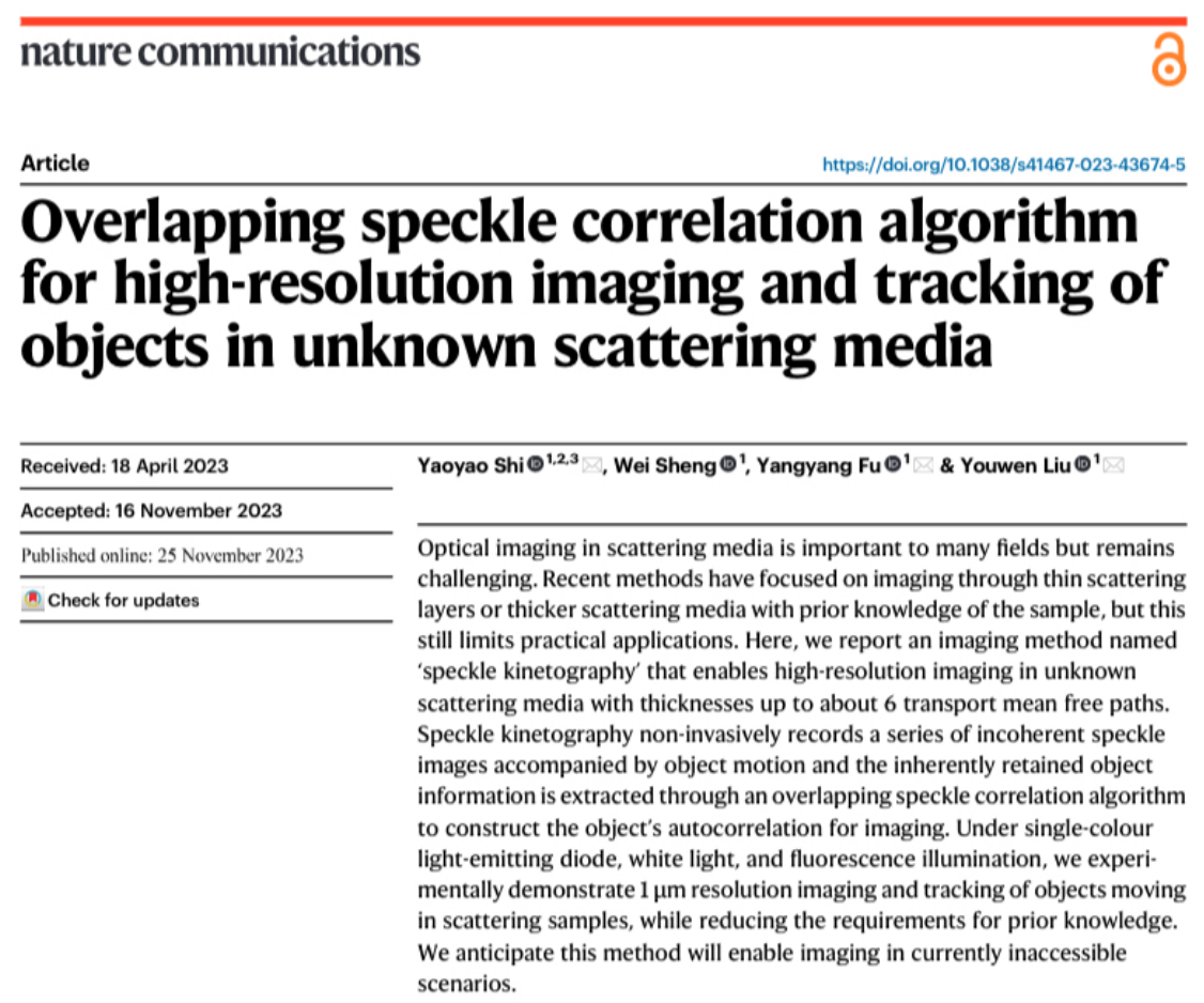 近日,必威betway西汉姆信息光子学团队针对透过强散射介质光学成像难题,提出一种基于散斑的运动成像术,能够在白光照明下对隐藏在未知厚散射介质中的运动目标实现高分辨成像与追踪。相关成果以“Overlapping speckle correlation algorithm for high-resolution imaging and tracking of objects in unknown scattering media”为题在线发表在国际顶级期刊《Nature Communications》上。施瑶瑶讲师为第一作者,施瑶瑶、伏洋洋、刘友文为该工作的共同通讯作者,盛伟老师对该工作也做出贡献。