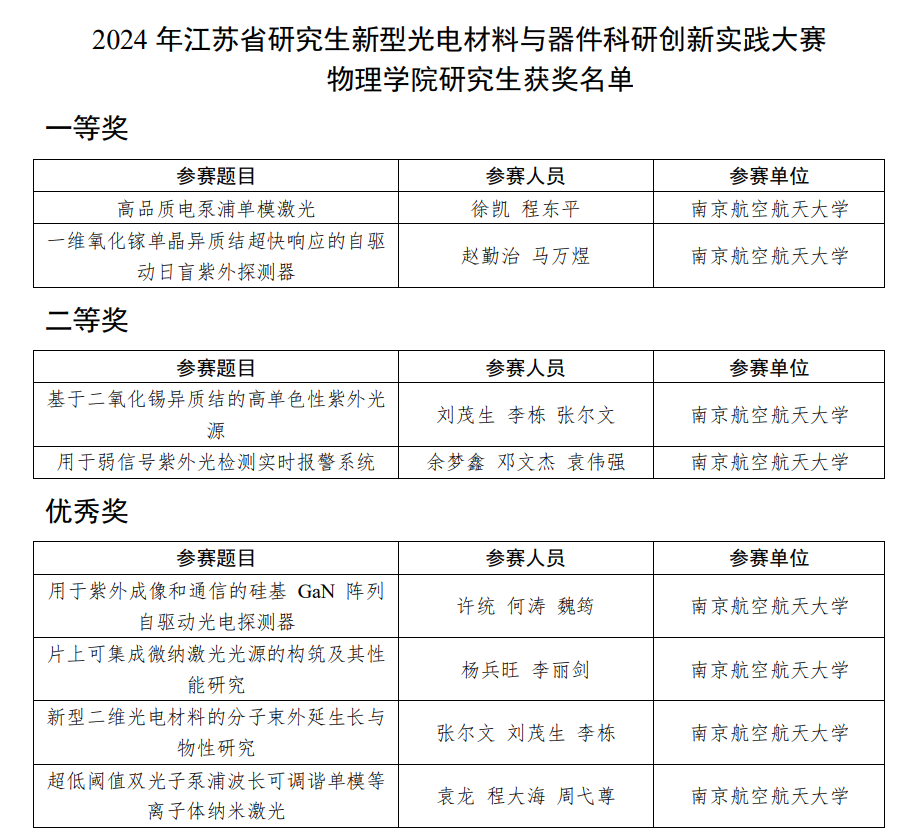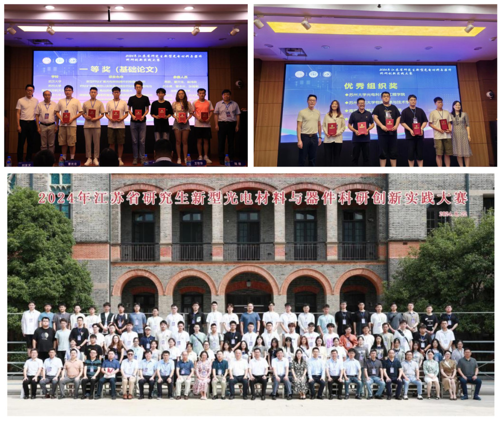 近日, 2024年江苏省研究生新型光电材料与器件科研创新实践大赛在苏州举办。我院研究生积极参赛,共荣获一等奖2项、二等奖2项、优秀奖4项,学院获得“优秀组织奖”。