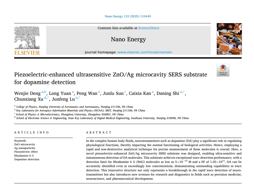 必威betway西汉姆光电功能材料器件与物理研究团队卢俊峰副研究员、施大宁教授与东南大学徐春祥教授合作,基于ZnO材料特有的压电特性,构建出一种压电增强型微腔结构SERS基底。本工作利用压电场来调控基底富集物质分子的能力,并协同回音壁模式(WGM)效应和局域表面等离激元共振效应(LSPR)耦合作用,实现了多巴胺分子的超灵敏探测,显示出优异的痕量检测性能。相关成果以“Piezoelectric-enhanced ultrasensitive ZnO/Ag microcavity SERS substrate for dopamine detection”为题在线发表在能源材料期刊《Nano Energy》上。博士研究生邓文洁为该工作第一作者,卢俊峰副研究员、施大宁教授、东南大学徐春祥教授为共同通讯作者。