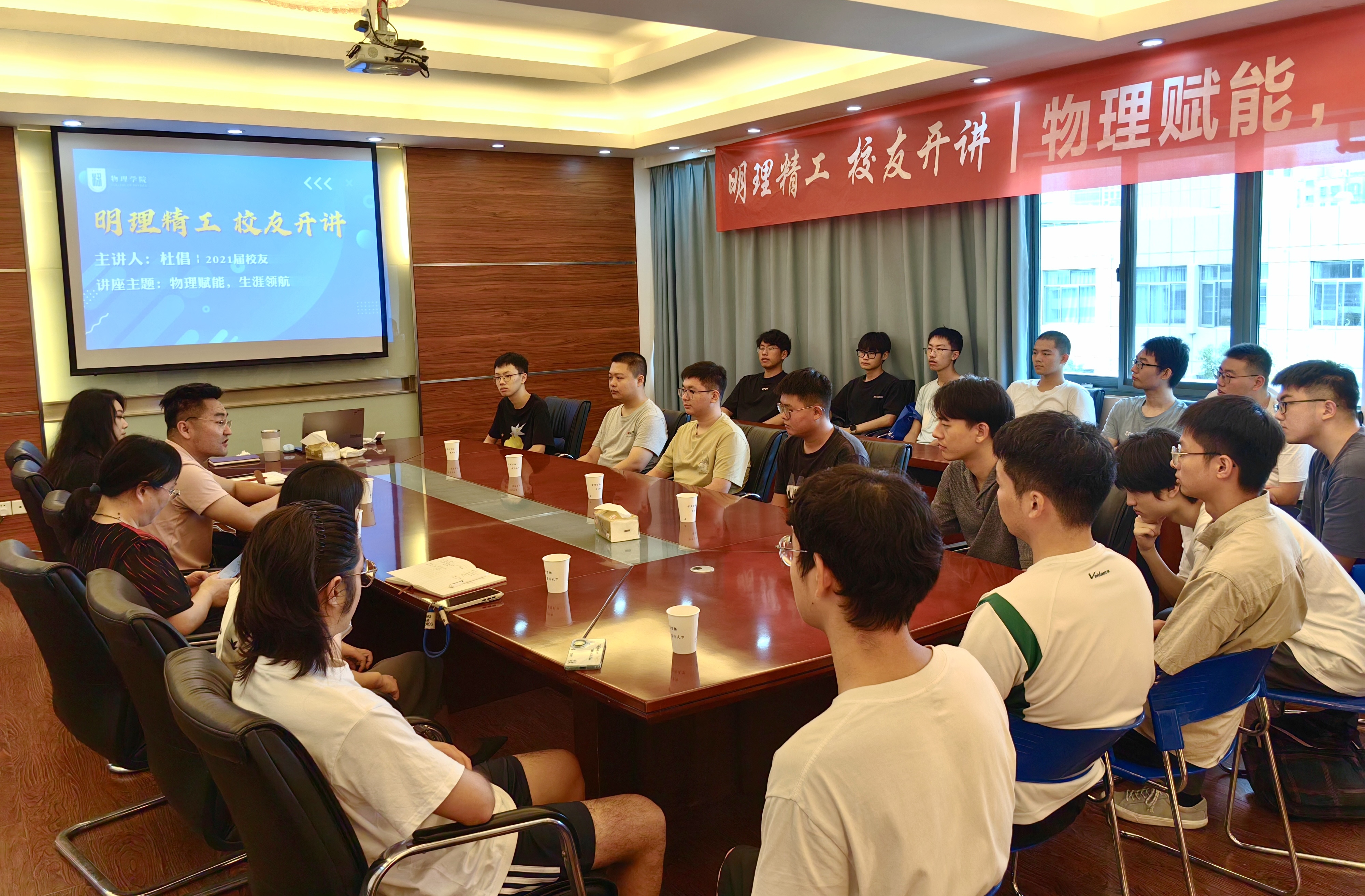朋辈交流环节,物理学专业2023 级硕士程冬平结合自身课程学习与科研入门经历,分享了研究生学习中的实用技巧,帮助新生快速适应研究生学习节奏;物理学专业2022级博士李潇围绕科研攻坚话题,讲述了自己在实验瓶颈期的调整方法,鼓励新生保持耐心、及时与导师同学沟通;物理学专业2024级博士生、“先锋计划”硕博实践团成员王书皓分享了暑期在国防科研单位的实践见闻,号召新生扎根基础研究,以实际行动助力国家科技自立自强。