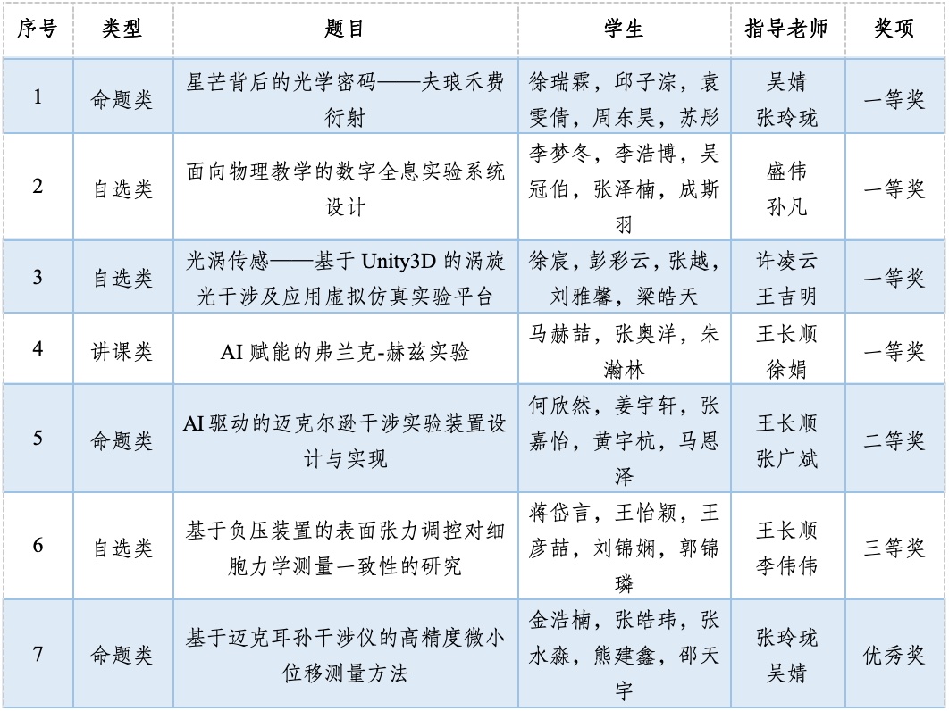 南航代表队在学校教务部的大力支持和必威betway西汉姆的精心组织下,共派出7支队伍参赛,其中有5支队伍成功晋级全国总决赛,共获一等奖4项、二等奖1项、三等奖1项,优秀奖1项,创参赛以来最好成绩!我校一等奖获奖数量与获奖比例均位居全国参赛高校前列,是一等奖覆盖所有赛道(讲课类、自选类和命题类)的高校,同时我校连续第六年成功摘得优秀组织奖,充分彰显了学院在物理实验教学与创新人才培养方面的深厚积淀。
