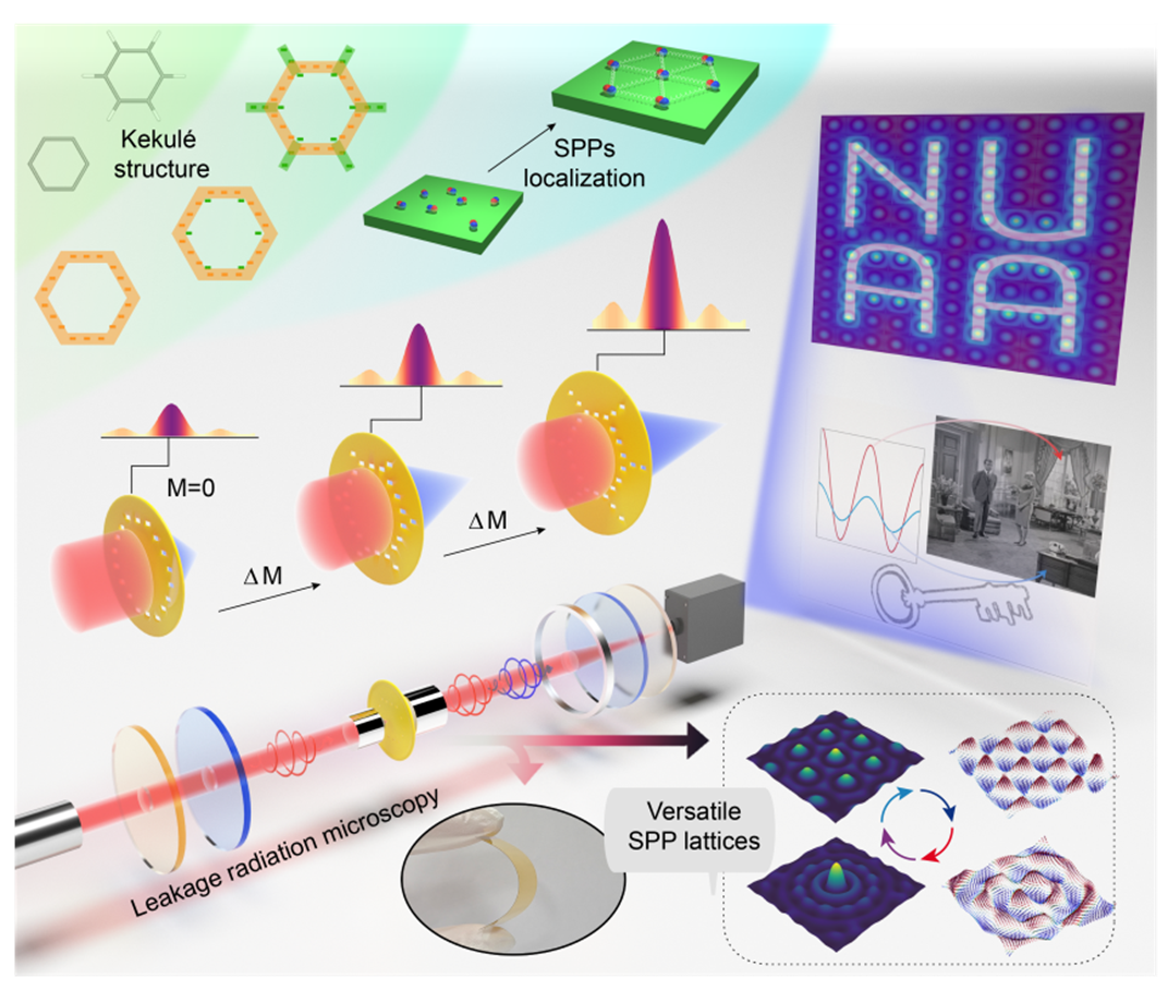 表面等离子体激元(SPP)从早期被定为横磁极化的表面波,已发展为具有准粒子本征属性的二维光学准粒子,且其动力学由电磁场、材料介电响应、结构几何与多体散射等多因素共同决定。而将SPP有序排列成面内晶格,不仅能揭示丰富的多体与量子动力学并对平面SPP放大器、紧凑辐射源及集成纳米光子器件具有重要意义,然而现有研究仍缺乏一种在二维极限下既能宏观探测又能精确调控SPP准粒子有序化与演化的多功能平面平台。为此,团队提出并实现了基于Kekulé超表面的人工等离激元SPP晶格体系。通过将纳米狭缝首尾相接成六边形并叠加翼状纳米狭缝,实现了晶格位点空间分布与相对强度的多自由度可控调节,同时采用泄漏辐射显微平台对SPP在二维极限下的局域化与晶格演化进行可视化验证,完成理论与实验的协同证明。基于此可调平台,研究团队进一步展示了可重构的片上发光阵列及高安全性的图像加密/解密方案的应用,实验证明通过与外翼纳米狭缝的耦合可以同步调控SPP的轨道角动量、拓扑电荷与强度分布。该工作不仅提供了一种用于宏观探测与定向操控二维SPP准粒子的新型超表面方案,也为微纳激光器、光学信息安全以及二维体系中准粒子行为的深入研究开辟了新的实验平台与技术路径。