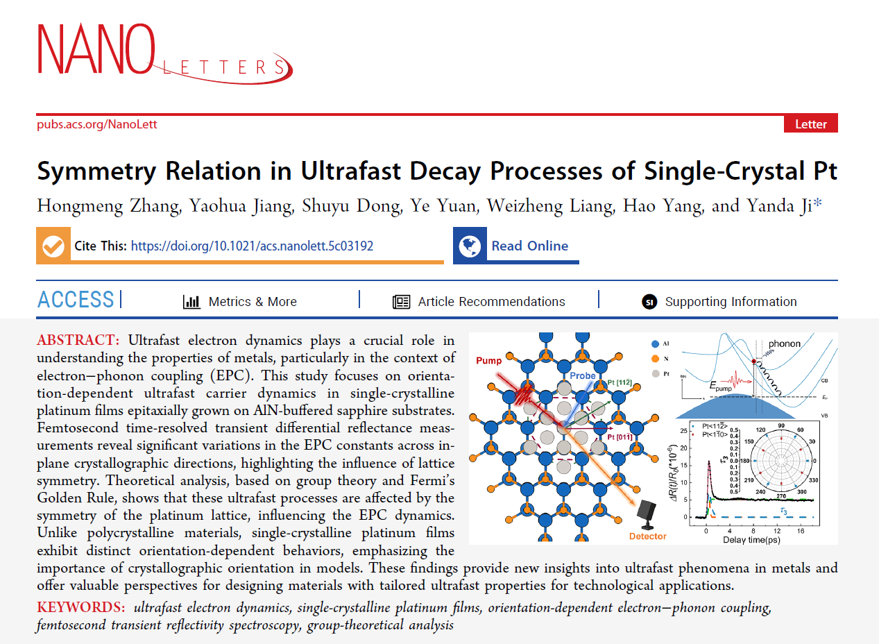 近日,必威betway西汉姆杨浩教授团队在金属超快动力学与电子–声子耦合(EPC)研究方面取得新进展。相关成果以《Symmetry Relation in Ultrafast Decay Processes of Single-Crystal Pt》为题,被国际期刊《Nano Letters》接收发表。吉彦达副教授为论文通讯作者,南航必威betway西汉姆博士生张泓萌为第一作者。