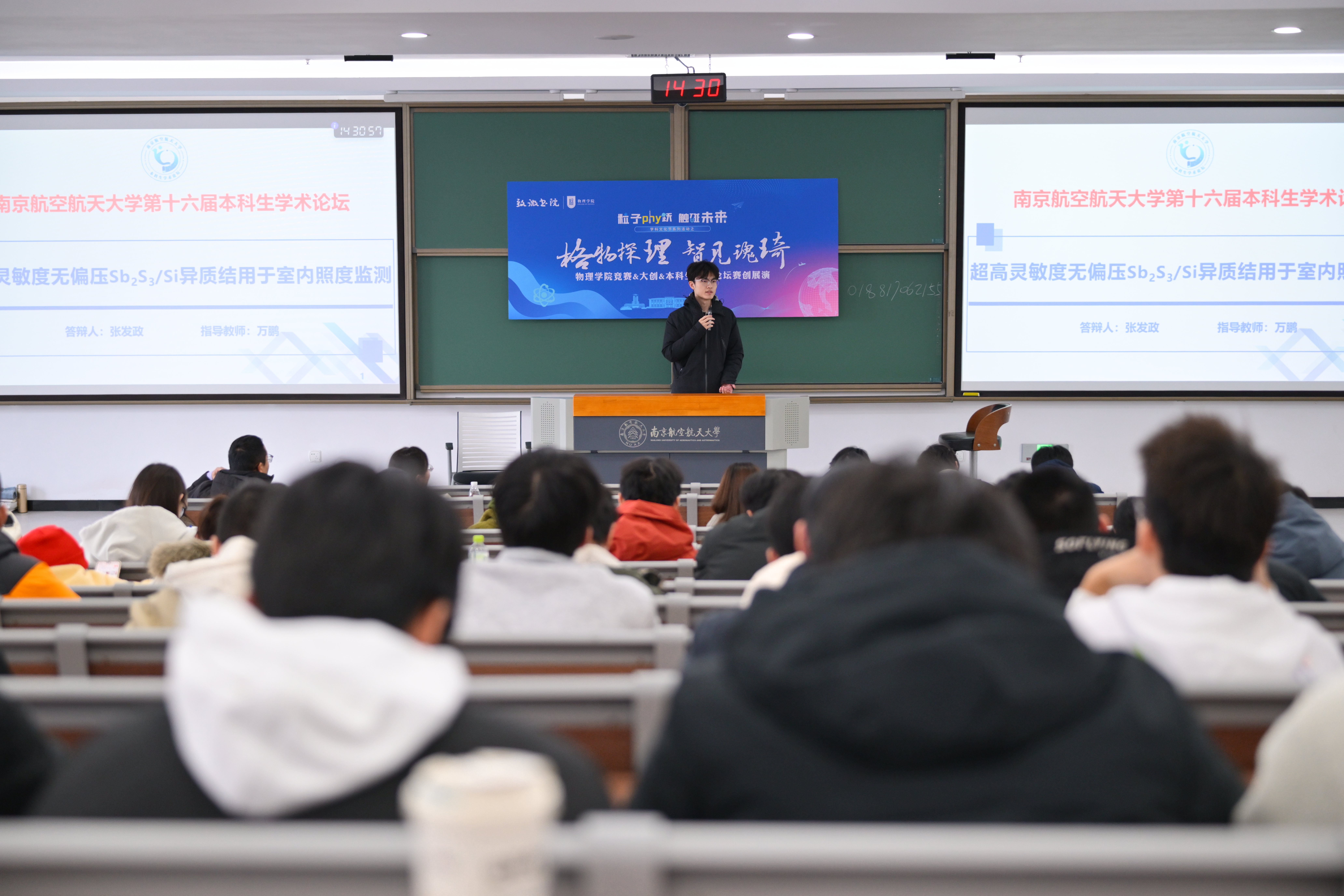 分享环节,中国大学生物理学术竞赛/全国大学生物理实验竞赛获奖学生代表、本科生学术论坛一等奖获奖学生代表、国家级/省级优秀大创项目负责人依次登台,带来干货满满的经验分享:通过复盘赛事流程,分享备赛磨合、科研探究等关键经验,引发在场学生强烈共鸣;围绕学术论坛全流程,细致讲解选题策略、论文撰写等核心经验,为学术表达提供针对性指导;结合自身科研经历,剖析项目背景挖掘、创新点提炼等方法,帮助低年级学生建立科创项目开展的逻辑认知,推动跨专业深入探讨。现场围绕技术融合、跨学科应用等热点问题深入交流,互动氛围浓厚、思维碰撞不断。